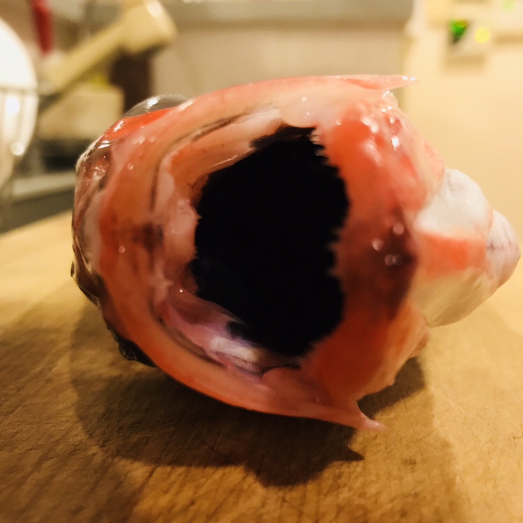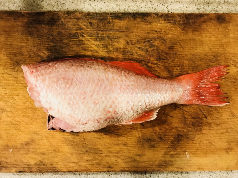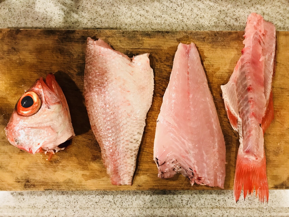 まな板が少々ヤンチャな色になってるのはご愛嬌。ノドグロ さんはウロコがとても柔らかくて落とし易いですね。これが真鯛とかになると硬くて少し大変だったりするのですが。。